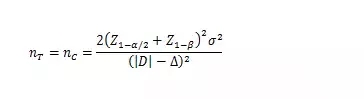以下公式中,nT、nC分別為試驗(yàn)組和對(duì)照組的樣本量;Z1-α/2、Z1-β為標(biāo)準(zhǔn)正態(tài)分布的分?jǐn)?shù)位,當(dāng)α=0.05時(shí),Z1-α/2=1.96,當(dāng)β=0.2時(shí),Z1-β=0.842;(Z1-α/2+Z1-β)2=7.85